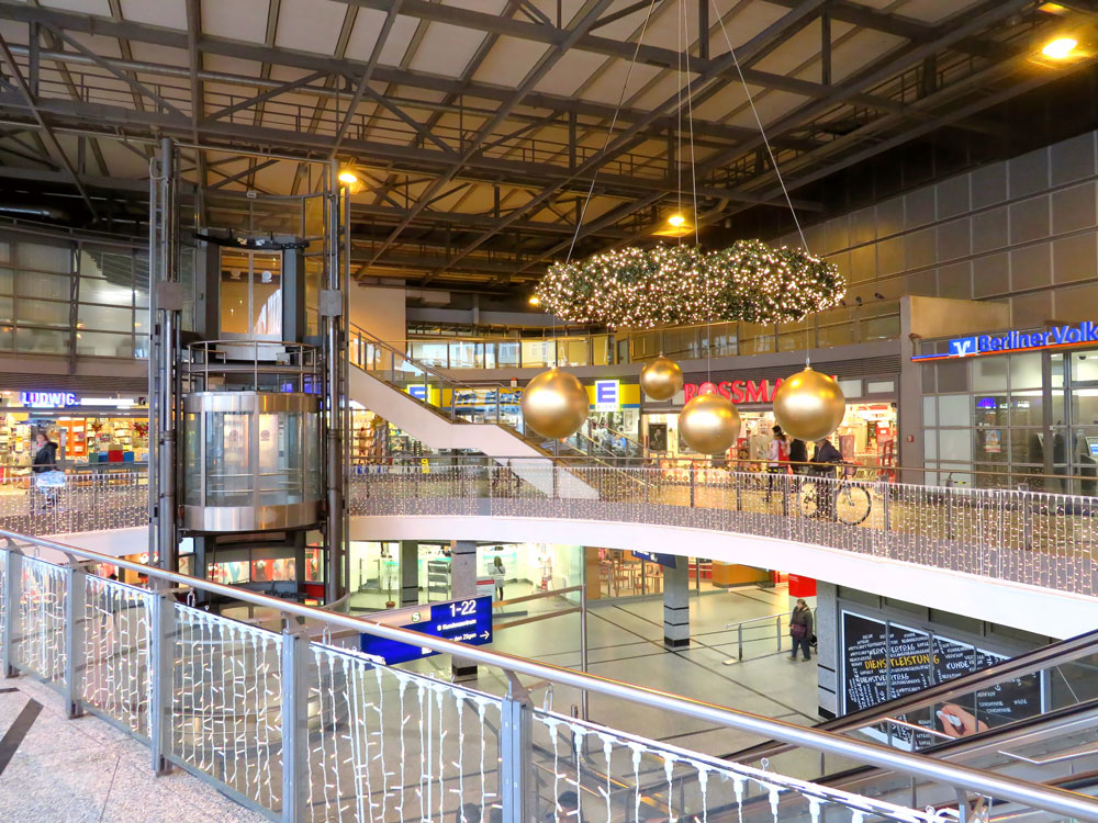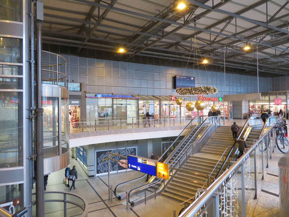 Umbau - Erweiterung - Sanierung mit Einbau neuer Galerieebenen, neuem Vermarktungskonzept und Reisezentrum, einschließlich Fahrtreppen, festen Treppenanlagen sowie freistehendem Aufzug über drei Geschossebenen. Einbau neue Hallendecke und Rückwände mit Vordach auf Platzebene.