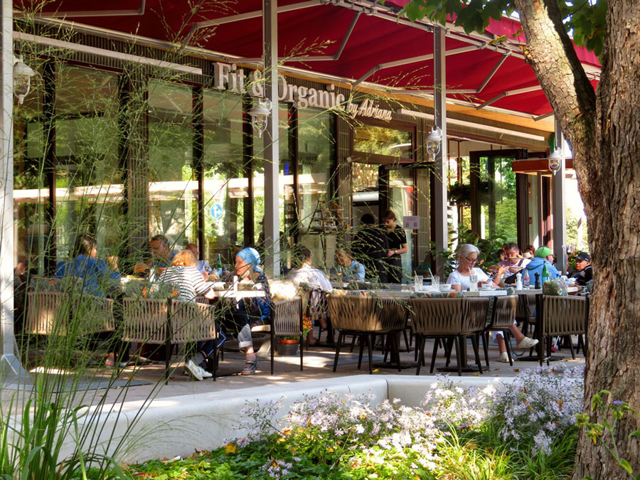 Neubau eines Parkcafés für den Gastronomie- und Barbetrieb. Das Parkcafé verfügt über eine großzügige Gartenterrasse sowie vollständig zu öffnende Fassaden. Dadurch entstehen fließende Übergänge zwischen Park, Terrasse und Gastraum.