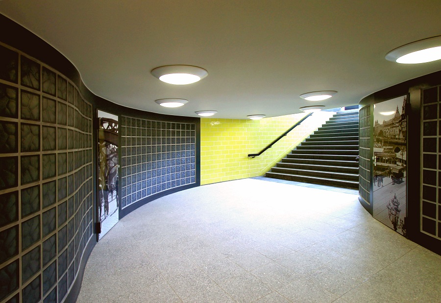 In dem Zuge erfolgte die Neugestaltung aller Wände mit keramischen Fliesen gemäß historischem Vorbild, bzw. Emaille nach Bemusterung mit der Unteren Denkmalschutzbehörde.